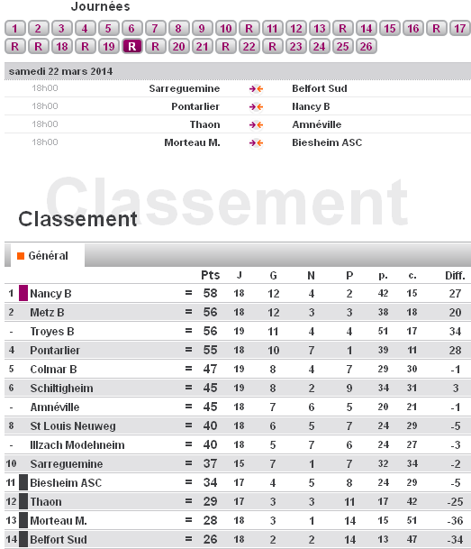 Reste à battre METZ B (qui devrait se voir retirer des points pour un match perdu sur tapis vert, mais je ne sais plus lequel) et ce même PONTARLIER que l'on va rencontrer très prochainement :wink: .
