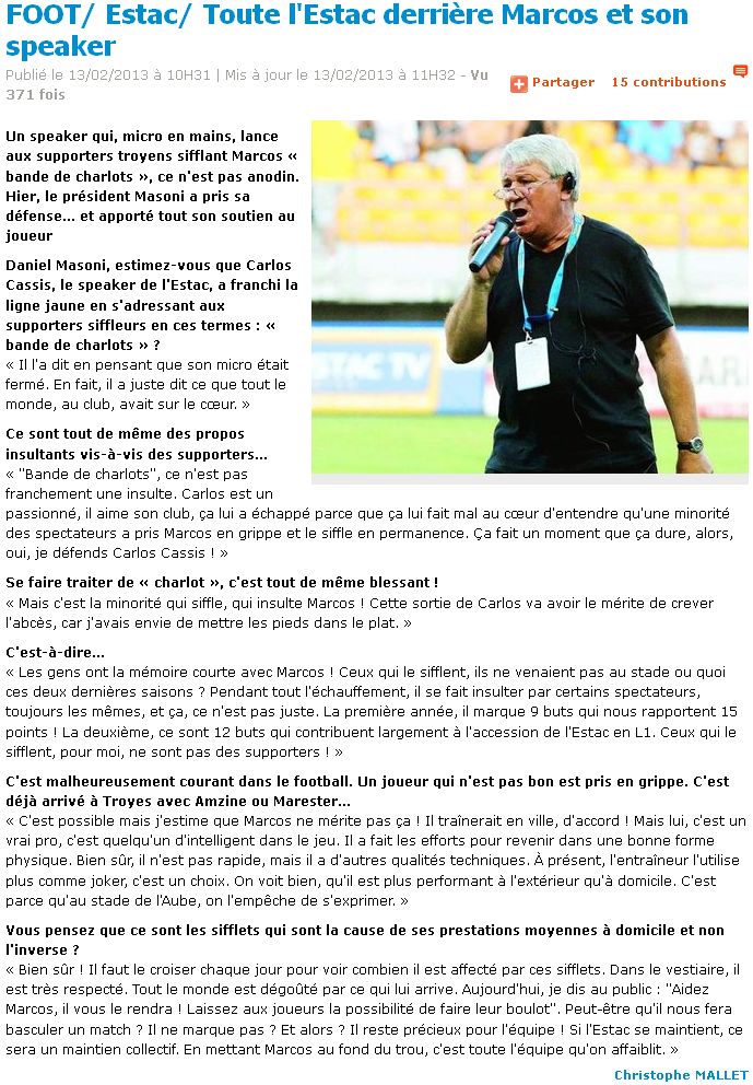 Merci carlos, pour l'image du club! Je vous en veux car VOUS êtes un pro de la com. et VOUS avez fait une erreur pro. impardonnable, à contrario des pseudo supporter qui sifflent Marcos qui eux sont juste nazes mais loin d'être des pro. (du foot et de la com.), pire, ils payent ou font des bornes pour venir s'exprimer(avec plus ou moins de réussite) dans un stade glacial !