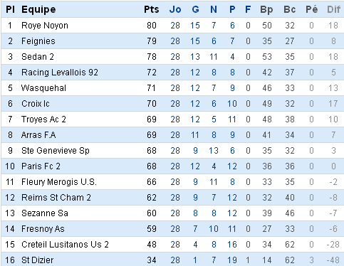 Sedan encore premier mais aillant fait mach nul contre Ste Geneviève pourrait se retrouver 3ème et se faire passer par Feignies et Royes, si ceux ci gagnent aujourd'hui.