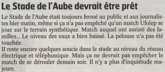 cest vrai que cette possibilité dun nouveau report est stressante. je pense que le peu de communication autour de cette hypothese est surement du que la situation hydrologique reste incertaine et conditionnee par la meteo des prochains jours et que le club veut gerer chaque chose en son temps. imaginez limpact que pourrait avoir un nouveau report avec changement de terrain sur les joueurs a quelques heures dun match importantissime contre ajaccio. je pense quon aura davantage dinfos demain ou au plus tard lundi...