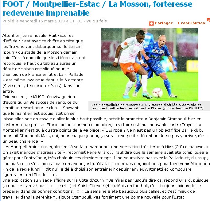 Frédéric Garny (ex milieu de terrain MHSC 1997-2000) : « Ce sera un match difficile car Troyes s’est bien relancé dans la lutte pour le maintien en battant Reims la semaine passée tandis que les Montpelliérains auront à coeur de repartir sur une série positive après la défaite à Nice. Quoi qu’il en soit Troyes est une équipe qui ne ferme pas le jeu. Contrairement à beaucoup d’équipes qui jouent le maintien, je ne pense pas qu’ils viennent à La Mosson comme d’autres relégables, juste pour verrouiller et essayer de prendre un point. Je m’attends à un match ouvert. »